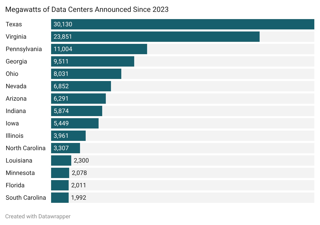 - A 2025 Wood Mackenzie analysis tracks proposed data center projects since 2023, ranking the top 15 states in the country by megawatts (MW). CXC used this to identify states where the buildout of data centers is expected to be highest, based on demand, and we refer to them as “high-growth data center states” in this analysis.