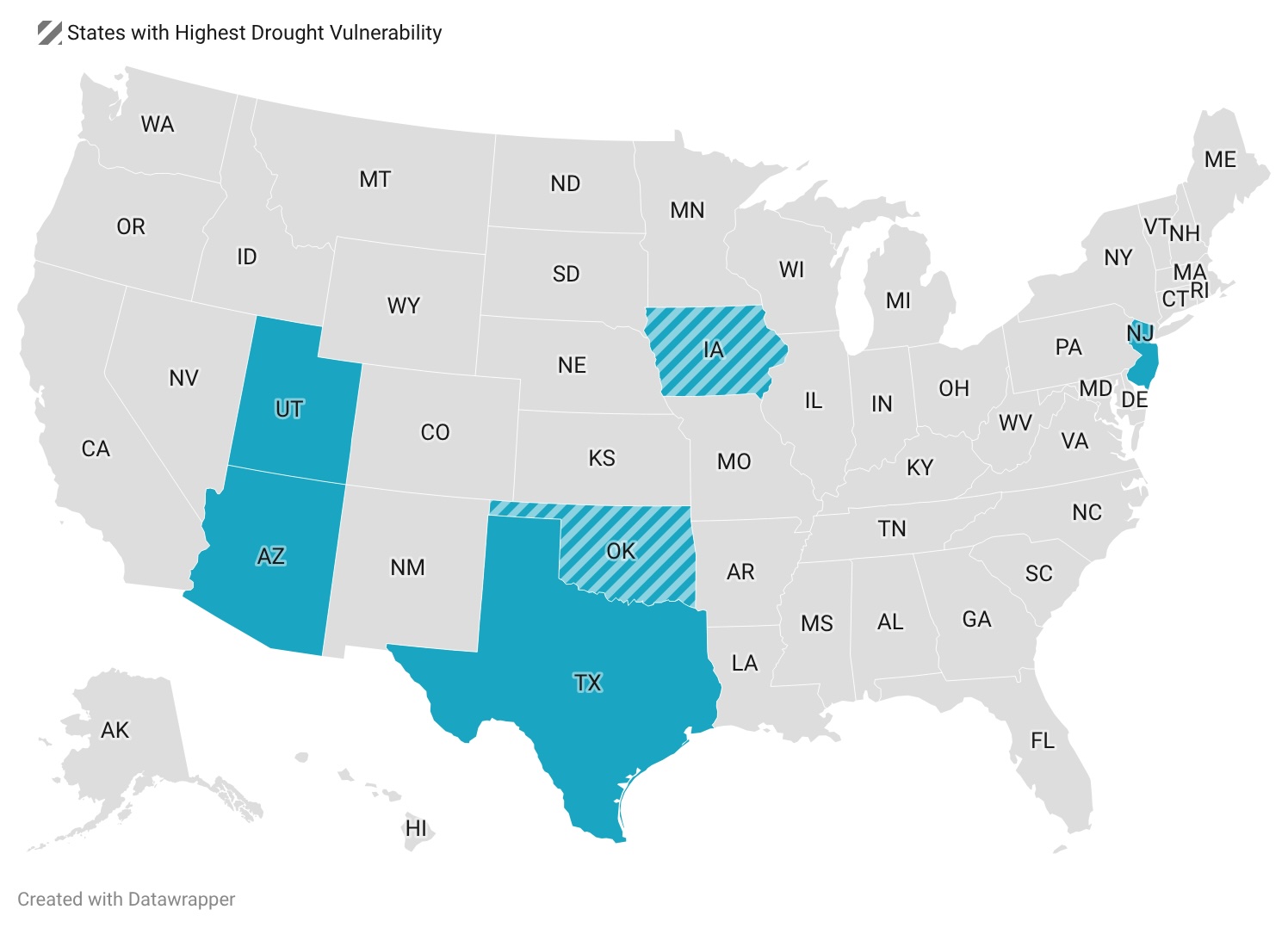 Rapid data center expansion threatens freshwater supply, as significant withdrawal of fresh water may lead to aquifer exhaustion, particularly in water-stressed areas. Like many impacts, water use and water pollution from data centers remain a black box; one study found that less than one-third of data centers actually report their water use. To identify states vulnerable to water stress, Climate XChange looked at 2023 data center demand, total water withdrawals in each state, and drought vulnerability by state. This analysis identified six states where data center water demand is most likely to contribute to water management problems, considering proportional water demand and state-level water resources.
