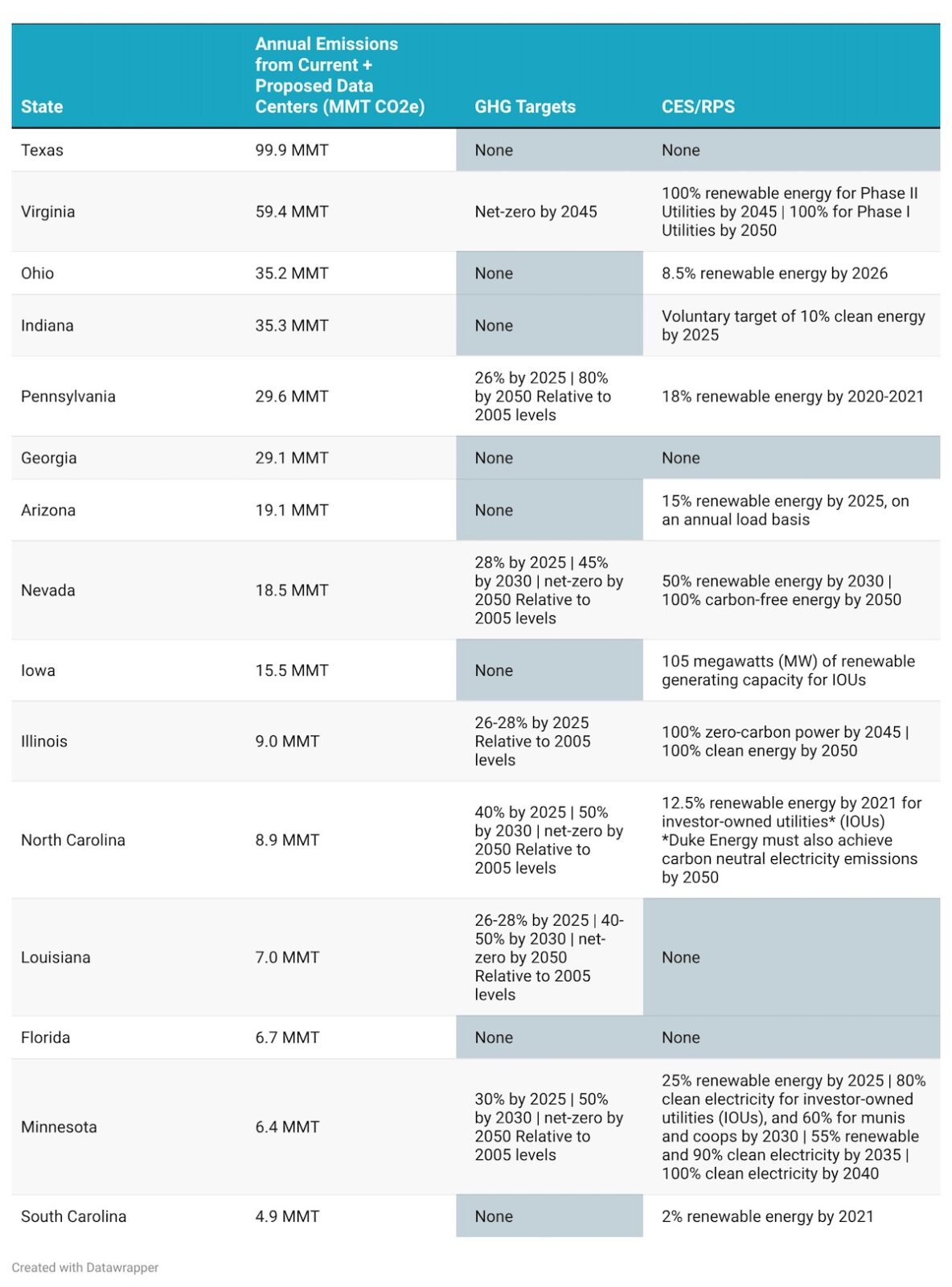 Nationally, we’re seeing the largest data center buildout in states that have not enacted many climate policies. It’s important to note that existing climate policy (or lack thereof) does not seem to be a driving force behind data center siting decisions; factors like proximity to necessary infrastructure, geography and climate, power reliability, and tax incentives are driving these decisions. However, buildout in states that lack clean energy targets is a concerning trend when considering data centers’ impacts on air quality and emissions.