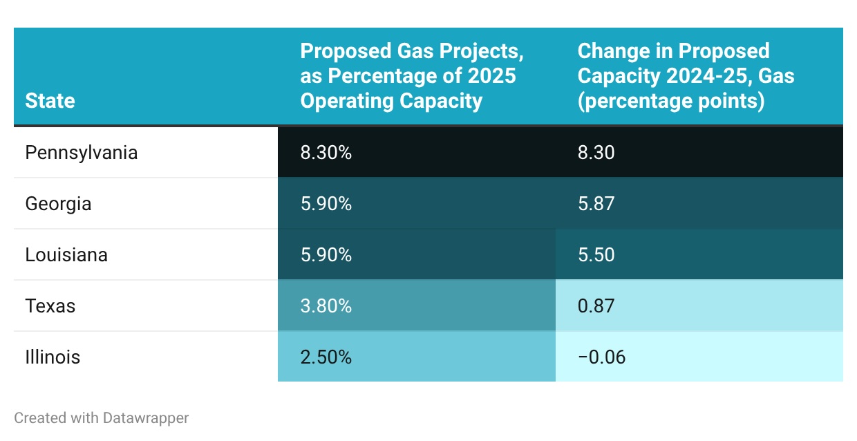 Five “high-growth data center states” had new gas proposals in 2025. Of those states, Pennsylvania, Louisiana, and Georgia saw new gas proposals equal to more than five percent of existing capacity. Among states with particularly high amounts of proposed fossil fuel generation, a handful showed an increase in new proposed gas plants between June 2024 and June 2025, indicating that rising data center demand may be occurring alongside increased fossil fuel development activity.