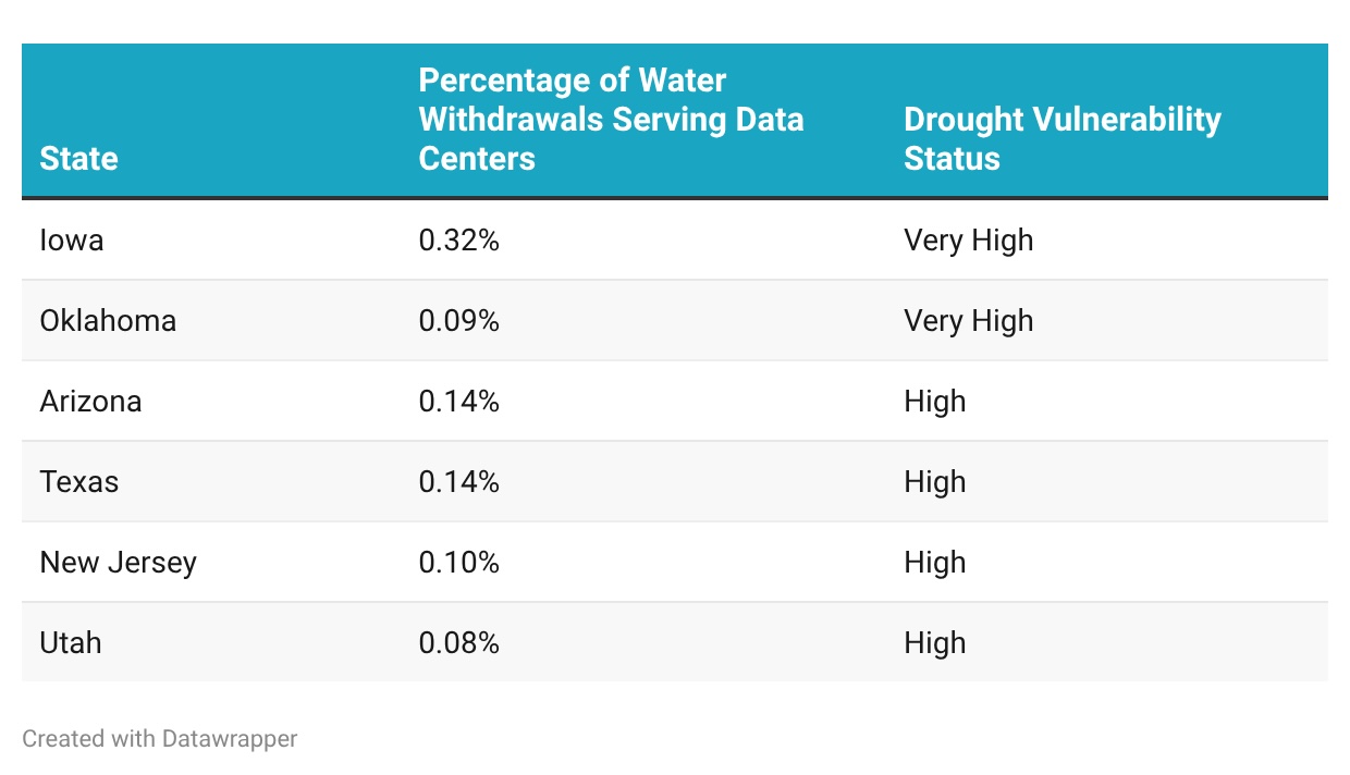 Table 5. States with Highest Percent of Data Center Water Withdrawals and Drought Risk