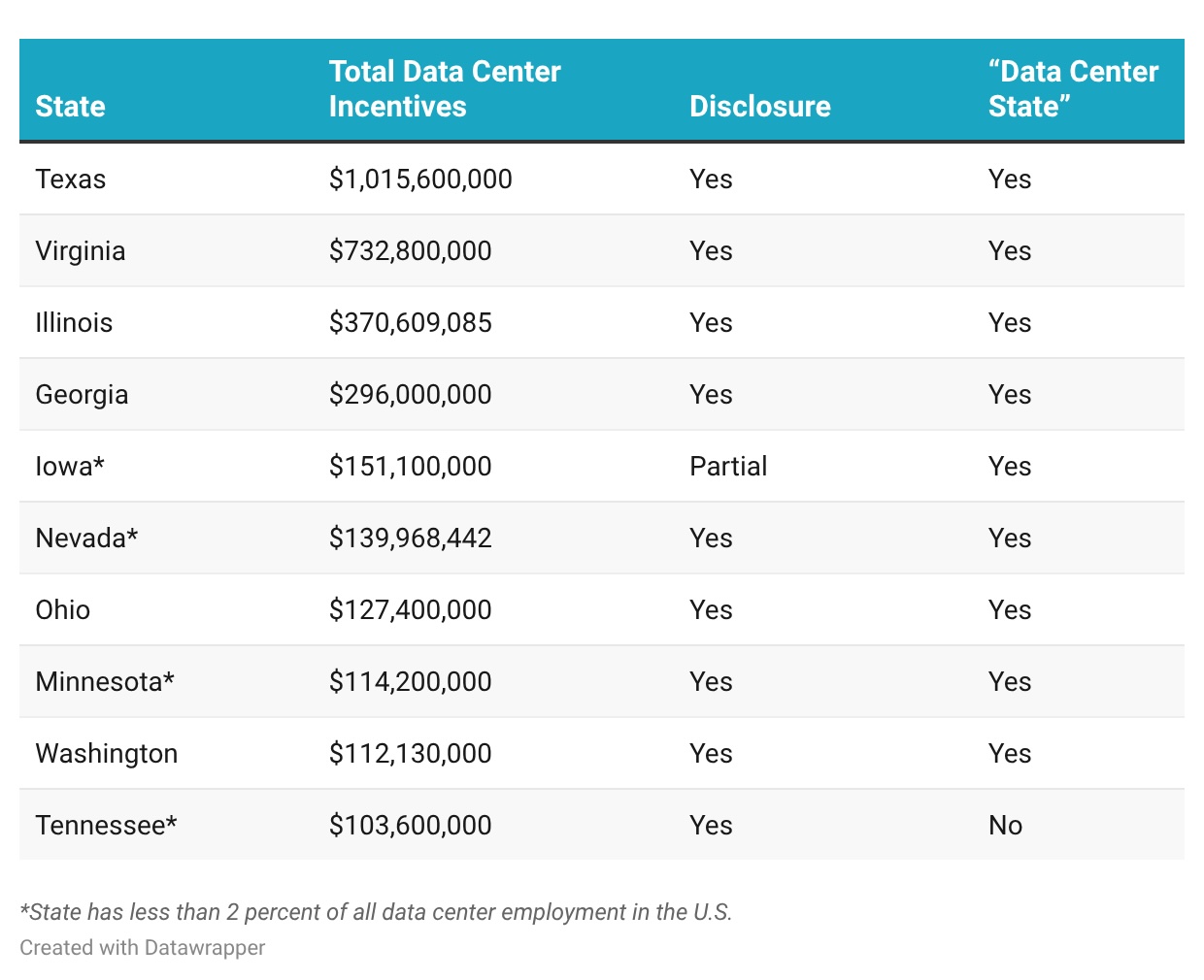 Table 6. Highest Data Center Incentive States, Disclosure, and Employment